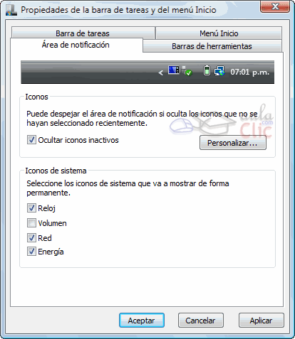 Desde aquí podemos personalizar el área de notificación de la parte derecha de la barra de tareas. Hemos visto que los iconos que no están en ejecución se ocultaban automáticamente. Eso es porque está marcada la opción Ocultar iconos inactivos. Desde el botón Personalizar, podemos concretar para cada icono si queremos que se oculte cuando esté inactivo, o que se muestre u oculte siempre. Y en Iconos de sistema encontramos los iconos que se muestran por defecto: Reloj, Volumen, Red y Energía (en portátiles). Podemos desmarcarlos para ocultarlos. El resto de iconos se podrán quitar desde la aplicación a que pertenecen.