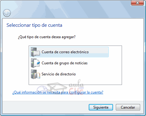 Windows Mail nos permite utilizar varios tipos de cuenta, que será lo primero que seleccionemos. En este caso, la opción que nos interesa es Cuenta de correo electrónico. Así que la seleccionamos y pulsamos Siguiente. |