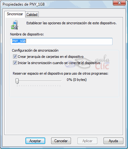 Podemos modificar el Nombre de dispositivo que se muestra en Windows Media, para que nos resulte más descriptivo. La opción Crear jerarquía de carpetas en el dispositivo, al estar marcada, hace que dentro de la carpeta Music en el dispositivo, se cree otra carpeta para el intérprete, y dentro de esta, otra para el álbum, que contendrá el archivo. Si lo desmarcamos, directamente se copiarán a Music. Iniciar la sincronización cuando se conecte el dispositivo, al estar marcada, hace que al conectar el dispositivo con Windows Media abierto, se abra el menú de Sincronizar. Si el mismo dispositivo lo usamos para el transporte de otros archivos, y se sincroniza de forma automática, puede que queramos garantizar un mínimo de espacio para esos otros archivos. Esto lo hacemos con el control Reservar espacio en el dispositivo para uso de otros programas.