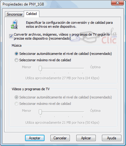 En la pestaña Calidad, configuramos la conversión de archivos al pasarlos al dispositivo. Lo normal es que lo que sincronicemos sea un reproductor mp3 portátil, y no sea necesario convertir nada. Pero por ejemplo, puede que tengamos una canción a 320 kbps y el reproductor portátil soporte un máximo de 192 kbps. En tal caso, si la opción Convertir archivos, imágenes, vídeos y programas de TV según lo precise este dispositivo está marcada y en Música está seleccionada Seleccionar automáticamente el nivel de calidad, se convertirá automáticamente. También puede que tengamos un dispositivo de poca capacidad, y que prefiramos introducir más canciones a costa de reducir su tamaño y calidad. En este caso, marcaremos Seleccionar máximo nivel de calidad, y elegiremos el que creamos conveniente. |