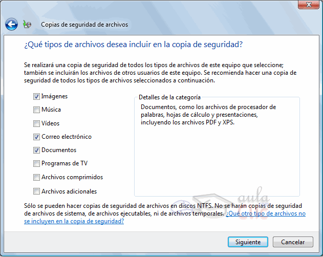 En la siguiente ventana indicaremos qué archivos deben copiarse. Las opciones a elegir corresponden a tipos de archivo, no a nombres de carpetas. Y se refieren a todos los archivos del equipo (de todos los usuarios) excepto los propios del sistema. En ningún caso se copiarán archivos ejecutables. Si estamos modificando la configuración de una copia existente, también encontraremos la opción para crear una copia de seguridad completamente nueva. Una vez elegidos los tipos de archivo, pulsamos Siguiente. En la próxima ventana debemos configurar cada cuánto tiempo se actualizará la copia de seguridad: