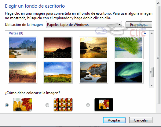 En Ubicación de la imagen, podemos elegir una de las carpetas disponibles en el desplegable, donde aparecerán las que trae por defecto el sistema, y las carpetas desde las que hayamos ido seleccionando fondos. Si preferimos no poner ninguna imagen podemos seleccionar Colores sólidos. Si quieres buscar en otra carpeta, puedes hacerlo a través del botón Examinar.... Una vez seleccionada la carpeta, aparece una vista previa con los fondos disponibles, para que seleccionemos uno de ellos. En la sección ¿Cómo debe colocarse la imagen? establecemos cómo se mostrará la imagen en caso de que sus dimensiones no coincidan con las de la pantalla: Una vez seleccionada la imagen deseada y el tipo de colocación, pulsa Aceptar.