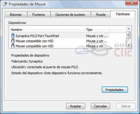 | En la pestaña Hardware podemos ver información relativa a la configuración hardware del ratón. ![]()