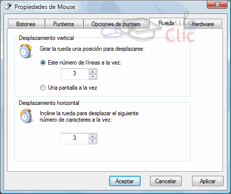 | En la mayoría de los ratones actuales, existe una ruedecita entre los botones. Al desplazarla, la pantalla se desplaza hacia arriba o abajo, como si pulsásemos en las barras de desplazamiento. Algunas ruedas incorporan la posibilidad de inclinarlas para desplazarse horizontalmente. Los paneles TouchPad no disponen de rueda, pero muchos consiguen el mismo efecto al deslizar el dedo por el lateral derecho hacia arriba y abajo. De todas formas, la configuración que explicaremos sólo es válida para ratones convencionales. Podemos personalizar el desplazamiento de la rueda en la pestaña Rueda. ![]()