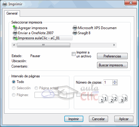 Al dar la orden de impresión del documento, aparece un cuadro de diálogo que nos permite modificar algunas propiedades de la impresión. Vamos a ver un cuadro de diálogo Imprimir con las funciones básicas, pero éstas podrán variar dependiendo del programa desde el que se imprima: