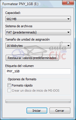 | Formatear un disco consiste en borrar toda su información, recuperando su formato inicial. Esta herramienta es útil cuando queremos asegurarnos de borrar todo su contenido si por ejemplo, contiene un virus. También suele solucionar algunos problemas en discos extraíbles, como Reproductores mp3. Esto borrará su contenido, pero no los archivos que permiten ejecutar el reproductor. Aunque en este caso, si el dispositivo trae un software para hacerlo, es mejor utilizar este último. Pasos a seguir: Desde Equipo, selecciona la unidad que quieres formatear con el botón derecho del ratón para desplegar el menú contextual. Selecciona la opción Formatear, se desplegará una ventana como la que te mostramos. ![]() En la mayoría de los casos, la Capacidad es la total de la unidad y se podrá modificar. En Sistema de archivos podremos elegir, según el caso, entre FAT, FAT32 o NTFS (para discos duros). En Tamaño de la unidad de asignación podremos elegir la misma. Lo normal, es que no se modifique ninguno de estos valores. Etiqueta del volumen es un nombre que identifica a la unidad, por ejemplo, al verlo en Equipo. Marcando Formato rápido, borramos el disco, pero sin formatear para ganar tiempo. Si lo que formateamos es un disquete, podemos marcar Crear un disco de inicio MS-DOS para crear un disco de arranque. Una vez seleccionadas las opciones oportunas pulsa Iniciar. Cuando termines pulsa Cerrar. Mucho cuidado con NO formatear el disco del sistema (C:) , a menos que quieras instalarlo todo de nuevo. |