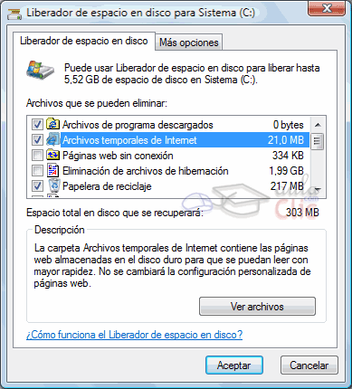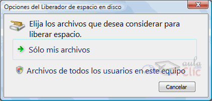 | Esta herramienta es muy útil ya que permite vaciar el disco de información que no se está utilizando, como por ejemplo los archivos temporales del sistema, archivos temporales de Internet e incluso vaciar la papelera. Para acceder a esta herramienta tendrás que desplegar el menú Inicio y seleccionar la opción Todos los programas, a continuación selecciona Accesorios y posteriormente Herramientas del sistema. Por último selecciona Liberador de espacio en disco. ![]() Si somos Administradores del equipo y hay otros usuarios, la primera ventana que se muestra nos permite elegir entre liberar espacio sólo de nuestros archivos, o de todos los usuarios del equipo. |