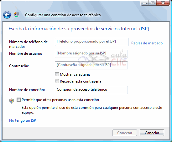 Debemos introducir el Número de telefono de marcado que nos proporcione el ISP. También nos proporcionará un Nombre de usuario y Contraseña. Si marcamos la casilla Recordar esta contraseña, no tendremos que escribirla cada vez que nos queramos conectar, pero podrá conectarse cualquier usuario del equipo. Al Permitir que otras personas usen esta conexión, quien tenga acceso al equipo, por ejemplo, desde una red local, podrá utilizar la conexión. En Nombre de conexión escribiremos el nombre que debe mostrar la conexión en el equipo.