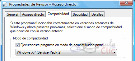 En Modo de compatibilidad, debemos marcar la opción, y seleccionar Windows XP (service pack 2) en la pestaña. Lo normal es que el programa fuese compatible con Windows XP, activando esta compatibilidad deberá funcionar (aunque no con una garantía del 100%).