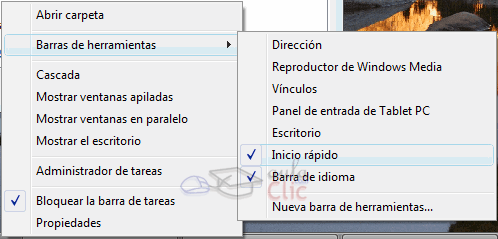 1) Hacer clic con el botón derecho del ratón sobre la barra de tareas. 2) Seleccionar la opción Barras de herramientas 3) Del menú que se despliega seleccionar la barra de herramientas que deseas visualizar. Si al lado de la opción aparece una marca quiere decir que esa barra de herramientas está visible. La opción Nueva Barra de herramientas, nos permite crear una barra personalizada. Para ello, deberemos crear una carpeta con los accesos directos que contendrá la barra, y elegirla al pulsar dicha opción. |