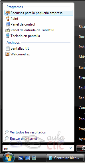 Para comenzar a buscar sólo tienes que empezar a escribir lo que quieres buscar, automáticamente Windows comenzará la búsqueda y mostrará los resultados de forma similar a como puedes ver en la imagen de la derecha. En nuestro caso, queriamos buscar como arrancar el programa Paint y habíamos introducido las dos primeras letras "pa" y ya hemos encontrado lo que buscábamos puesto que el icono de Paint aparece en la segunda posición. La búsqueda la podemos realizar por el nombre del programa, o por el del archivo ejecutable. Observa que los resultados de la búsqueda están divididos en dos zonas principales (aunque pueden aparecer otras, según los complementos instalados), primero muestra Programas y a continuación muestra los Archivos. Esto es así porque Windows supone que nos interesa más buscar programas puesto que la búsqueda la hemos realizado desde el lugar donde arrancamos los programas. Si pulsamos en Ver todos los resultados se abrirá la ventana de búsqueda general. También podemos Buscar en Internet y se abrirá el navegador Web.