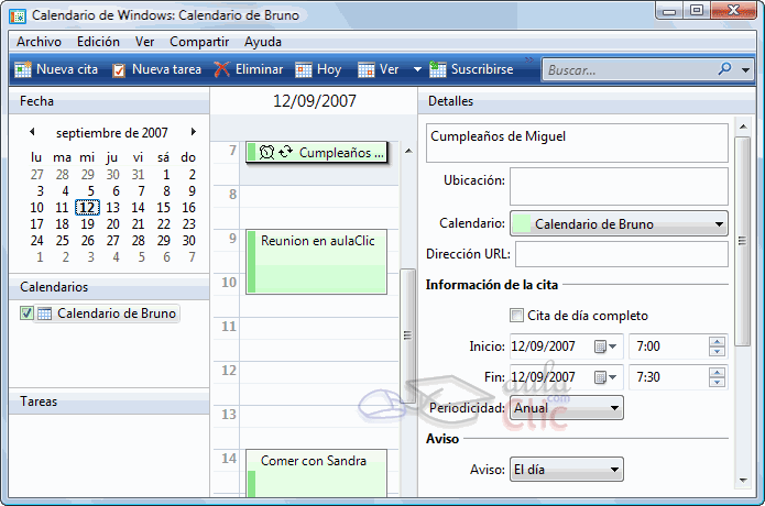 El calendario de Windows es una utilidad que nos hará las veces de agenda personal. En él podemos apuntar nuestras citas y tareas pendientes, fijando por ejemplo un aviso para no olvidar nada, o incluso que la misma cita se repita periódicamente. Podemos alternar el tipo de vistas, para ver desde todos los días del mes, hasta las horas del día. Si usamos la búsqueda desde el calendario, ésta buscará en nuestras citas y tareas. De ese modo, si introducimos el nombre de una persona, veremos todas las citas relacionadas con ella. |