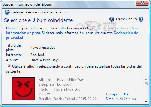 Aparecerán distintos álbumes con el título de la canción coincidente. Debemos elegir, si lo sabemos, el que corresponda, o pulsar en Detalles del álbum para comprobar con información más detallada si verdaderamente es ese álbum. Si el resto de las canciones pertenecen al mismo álbum, marcando Utilice el álbum seleccionado para marcar todas las pistas del asistente evitaremos tener que buscar independientemente cada canción. Si no encontramos resultados apropiados, en la lista de álbumes encontraremos las opciones Refinar la búsqueda, con la que podremos modificar qué se está buscando (útil para pistas sin información) y Editar información de pista, que nos permitirá introducir nosotros mismos la información del archivo.