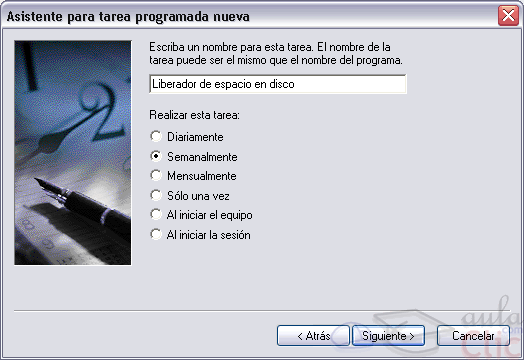| A continuación tienes que elegir la periodicidad de la tarea, es decir, si quieres que se ejecute diariamente, semanalmente, mensualmente, etc. Seleccionamos, por ejemplo, Semanalmente y pulsamos en Siguiente para contuinuar.
