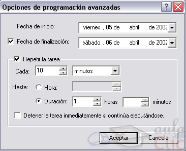 Esta ventana nos permite indicar desde qué fecha hasta qué fecha queremos que esta tarea se pueda ejecutar, incluso podemos indicar cada cuánto tiempo queremos que se repita, por ejemplo cada 10 minutos. También se puede indicar el tiempo máximo que permitimos que dure la ejecución de la tarea. |