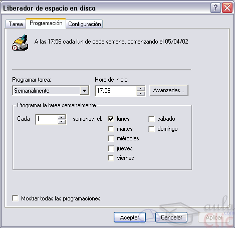 De esta pestaña lo más importante a destacar es la casilla Habilitada, al marcar esta casilla la tarea programada se puede decir que está activa, es decir, que cuando llegue el momento de ejecutarse lo hará mientras que si no está activada es como si la cancelaramos, por lo que no se ejecutará. |