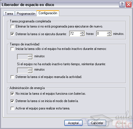 Es importante indicar el tiempo máximo que permitimos que una tarea se puede ejecutar para evitar que el ordenador esté procesando alguna tarea más tiempo del esperado, para ello hemos de marcar la casilla Detener la tarea si se ejecuta durante e indicaremos el tiempo máximo permitido. Es posible que alguna tarea que tenemos programada para que se ejecute en estos momentos no queramos que se active ya que estamos trabajando y esta podría relentizar bastante nuestro ordenador. Para evitar esto podemos indicar que la tarea se ejecute unicamente si el tiempo de inactividad es superior al que indiquemos, para ello marcar la casilla Iniciar la tarea sólo si el equipo ha estado inactivo durante al menos y después indicar los minutos. También puedes hacer que cuando el equipo vuelva a la actividad la tarea programada que se está ejecutando se detenga, e incluso podemos hacer que el equipo se active para realizar la tarea programada ( casilla Activar el equipo para realizar esta tarea). También podemos indicar que se inicie o no la tarea si el ordenador funciona con bateria. Como vemos WindowsXP nos proporciona gran flexibilidad a la hora de programar tareas.