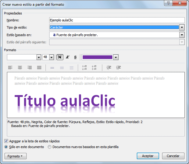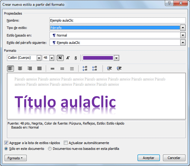Al crear y modificar estilos tenemos que rellenar un cuadro de diálogo con algunos cuadros y casillas de verificación que conviene explicar con un poco de detalle. Es lo que vamos a hacer en este tema avanzado.