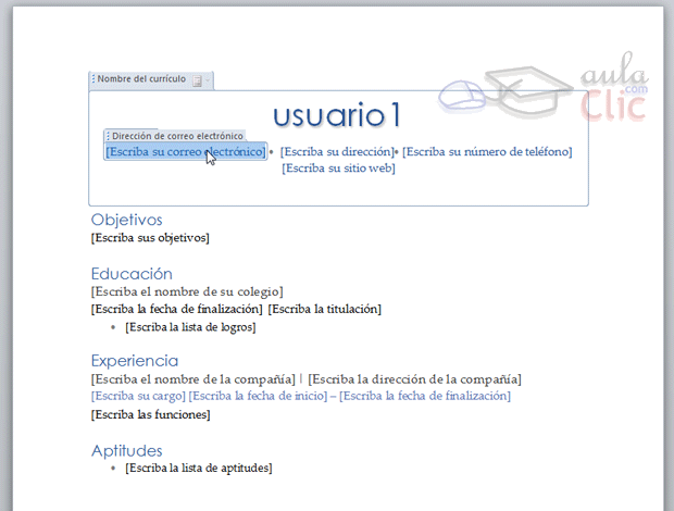 Lo más habitual es que el texto a modificar se distinga perfectamente del texto que no debería, en principio, cambiarse. Por ejemplo, en la imagen hemos aplicado una plantilla de currículum ejecutivo. En él distinguimos varios elementos perfectamente etiquetados. Veremos sus etiquetas al hacer clic sobre ellos, como es el caso de la Dirección de correo electrónico. Al hacer clic sobre el texto [Escriba su correo electrónico] ha pasado a mostrarse dentro de un borde azul etiquetado, en modo edición, para permitirnos cambiar el texto.