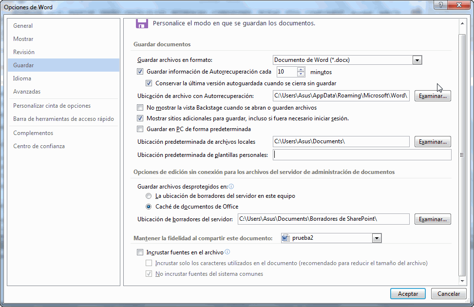 Se abrirá un cuadro de diálogo en el que seleccionaremos la categoría Guardar, donde aparecerán las opciones a modificar.