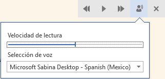 , aparece una pequeña barra de herramientas con la que podemos controlar la lectura del documento, sino además la velocidad de la misma, así como la voz utilizada (de forma predeterminada sólo hay una voz, pero pueden instalarse más si se desea). La voz, por supuesto, varía de país en país y del idioma seleccionado.