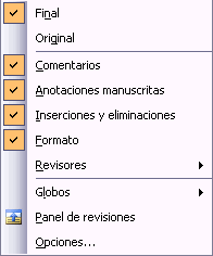 En el segundo cuadro despegable de la barra de revisión podemos indicar si deseamos ver el documento original o deseamos ver el documento final, también podemos seleccionar las marcas que deseamos ver / ocultar. Podemos seleccionar las marcas / comentarios de los revisores que deseemos ver. En el submenú Globos podemos indicar si mostrarlos u ocultarlos.