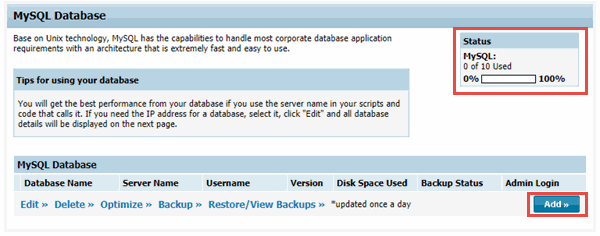 Como podemos ver en la siguiente imagen, no hay bases de datos creadas. Por tanto, pulsamos el botón Add: