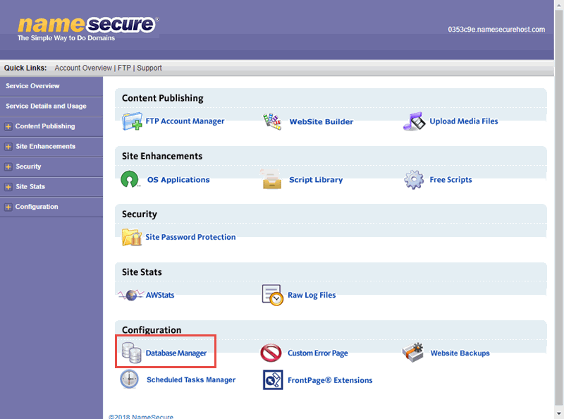 Como ya quedó visto, el acceso al hosting o servidor de Internet varía de proveedor a proveedor, así como la apariencia de sus servicios. Asimismo, los datos del usuario y la dirección del sitio, también dependen del hosting contratado, por lo que dicha información debe ofrecerla el proveedor. Pero veamos un ejemplo que muestra la similitud entre la instalación local de WordPress y la instalación manual en un servidor o hosting. Como ya enlistamos, debemos comenzar por crear la base de datos en el servidor. Por tanto, un requisito mínimo para que WordPress funcione en un hosting sin instalador de aplicaciones, es que debe soportar bases de datos MySQL o MaríaDB y el lenguaje de servidor PHP. El panel de control, entonces, debe permitirnos iniciar phpMyAdmin o, en su caso, crear la base de datos. La siguiente imagen corresponde a un servidor sin cPanel.