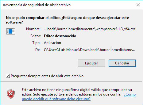 Ubica el archivo descargado en tu ordenador y dale doble clic. Lo primero que verás es una advertencia de seguridad de Windows en donde debes autorizar su ejecución.