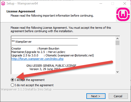 Lo que sigue es aceptar la licencia para su uso. En este caso, la licencia GPL (Licencia Pública General), que es la licencia del software libre, la misma que usa WordPress. Debes marcar que aceptas los términos. Pulsamos Next.