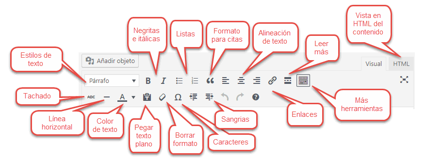A su vez, el área de edición de las páginas ofrece una serie de herramientas muy similares a las de un procesador de palabras. Estas mismas herramientas se utilizan también para la edición de entradas, por lo que es conveniente estudiarlas: