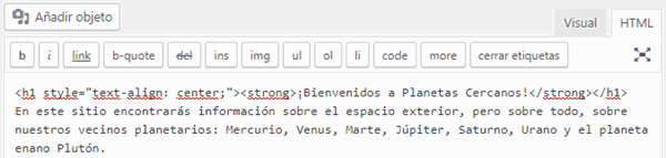 Por su parte, en la parte superior derecha del editor, tenemos una ficha con la que podemos editar la página directamente en HTML con aquellos que prefieran trabajar directamente con el lenguaje o que deseen insertar una etiqueta HTML que no esté incluida en la barra de herramientas. La página anterior en HTML se vería ahora así: