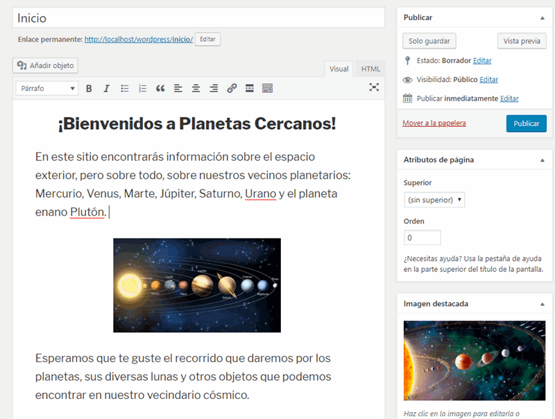 Por tanto, esta opción se utiliza para crear páginas con información fija de nuestro sitio, como las políticas de privacidad, el equipo de trabajo del sitio, o un discurso de bienvenida. Si queremos que nuestra página de inicio presente un texto de bienvenida, no sólo debemos crear la página, sino además debemos definirla como tal. Veamos. En la siguiente imagen hemos creado una página con la intención de que sirva como página de inicio.