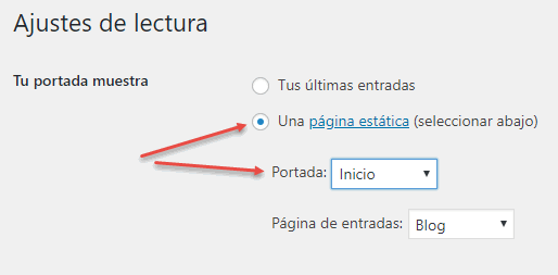 Una vez creada, podemos pulsar el botón Publicar y la página pasará a formar parte del sitio. Pero deseamos que se convierta en nuestra página principal o de portada. Para ello vamos a Ajustes-Lectura y la indicamos de ese modo.