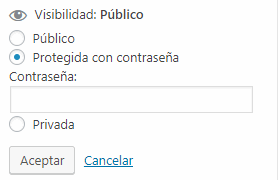 También podemos determinar su visibilidad. De ese modo podemos, por ejemplo, crear páginas que sólo son accesibles por contraseña, lo cual sería útil en determinados contextos corporativos: