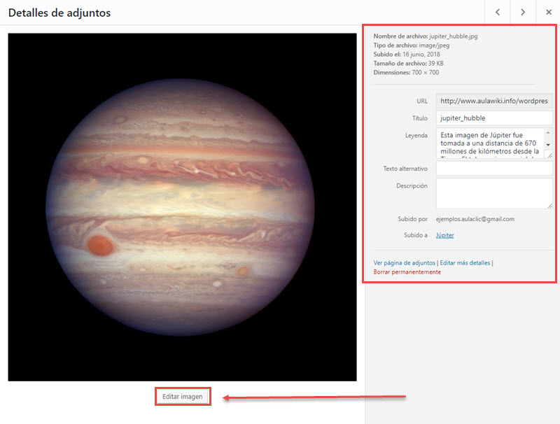 Cuando hacemos clic en un archivo en particular, podemos editar algunos datos, como el Título y la leyenda que acompañan a una imagen.