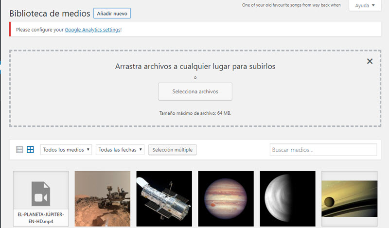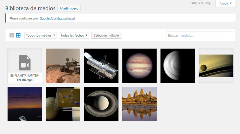 Así como es necesario en algún momento administrar la lista de entradas de nuestro sitio WordPress, es necesario también administrar el resto de los elementos que pueden añadirse. En primer lugar, los medios, como imágenes, videos y archivos se administran con la opción Medios - Biblioteca. Al pulsar esta opción obtendremos la lista correspondiente, aunque en vista de cuadrícula.