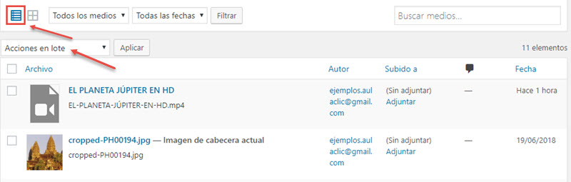 Un dato interesante es el de la columna Subido a, pues sabremos de ese modo en qué entradas ha sido utilizada cada imagen. Por otra parte, en esta vista podemos seleccionar dos o más archivos y aplicarles acciones en lote, aunque, en este caso, sólo se trata de borrarlos.